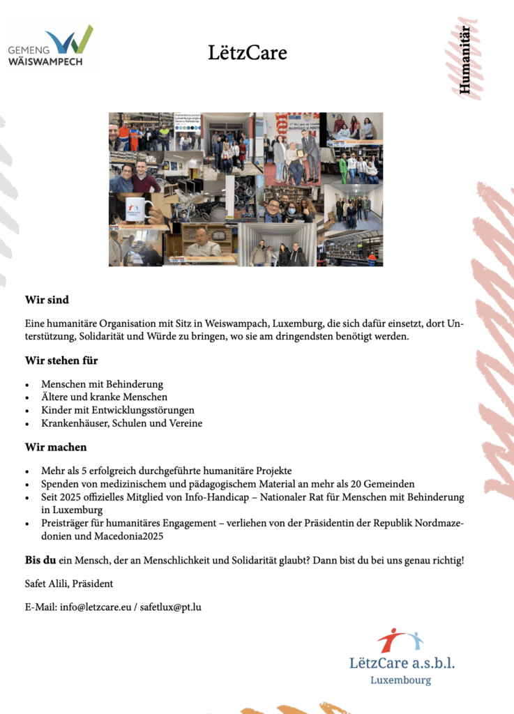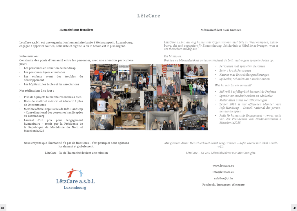 - Оваа статија за хуманитарното признание на LetzCare a.s.b.l. е објавена во официјалниот општински билтен 01/2025 и 02/2025