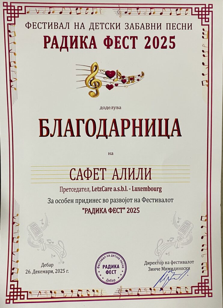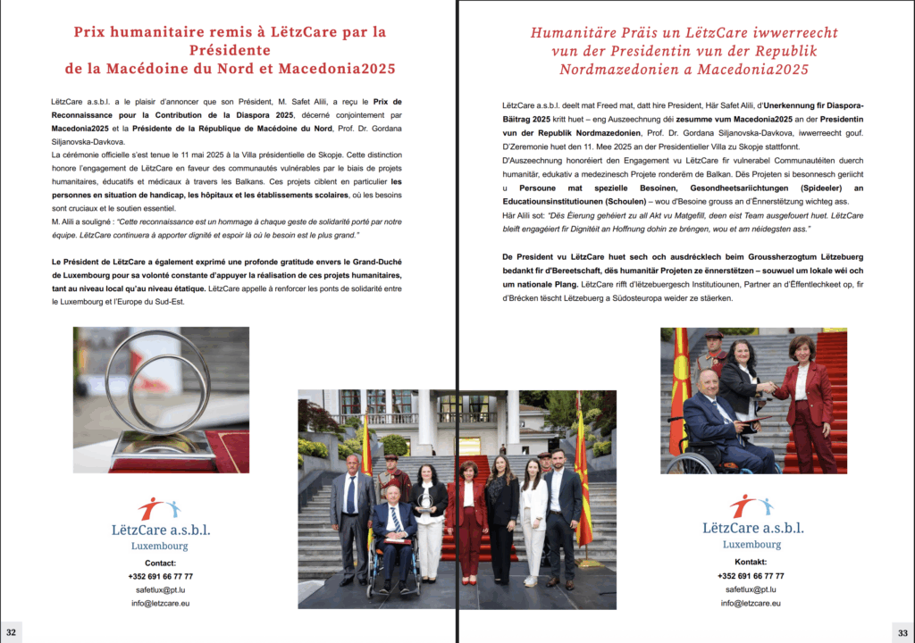 Am Mee 2025 krut LetzCare a.s.b.l. eng prestigiéis Unerkennung fir seng humanitär Missioun vun der Presidentin vun der Republik Nordmazedonien, Madame Gordana Siljanovska-Davkova, an der Organisatioun Macedonia2025. Wärend der offizieller Zeremonie zu Skopje goufen eis bis elo erreechten Ziler a virbildlech Ënnerstëtzung fir vulnerabel Populatiounen ënnerstrach.