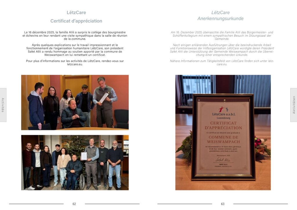 - Dësen Artikel iwwer d’humanitär Auszeechnung vun LëtzCare a.s.b.l. gouf am offizielle Gemengebulletin 01/2025 , 02/2025 an 01/2026 publizéiert.